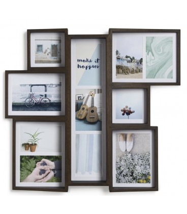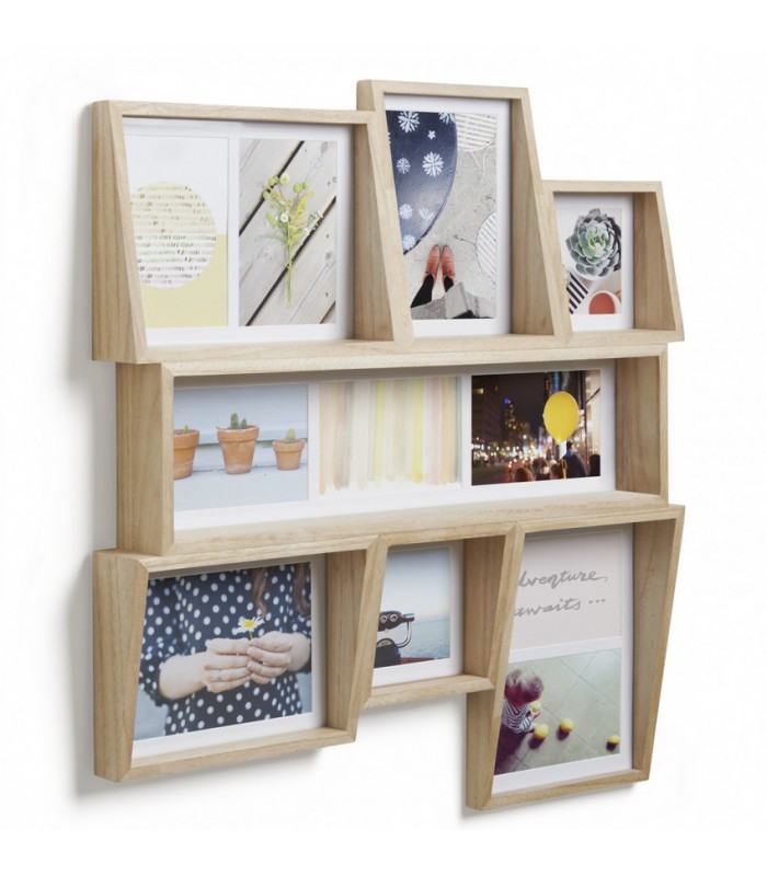 A new approach to a natural wood multi frame. Designed with unique angles to create a striking look while casting unique shadows depending on how it's positioned in frame. Can be hung both vertically or horizontally and has a built in shelf for small display objects.