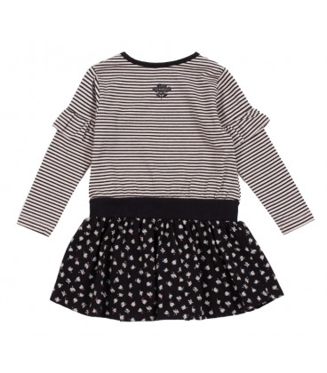 Striped jersey dress. Long sleeves with frills details. Style with snap buttons opening on shoulder, prints on chest and fitted waist. Printed jersey flared skirt.